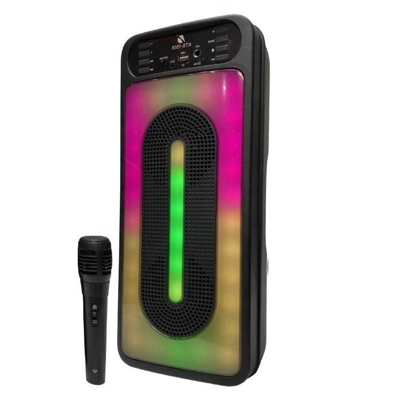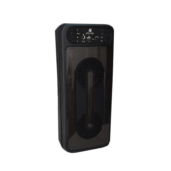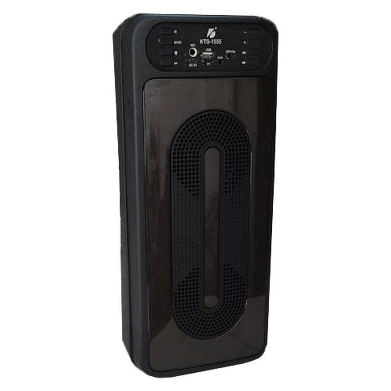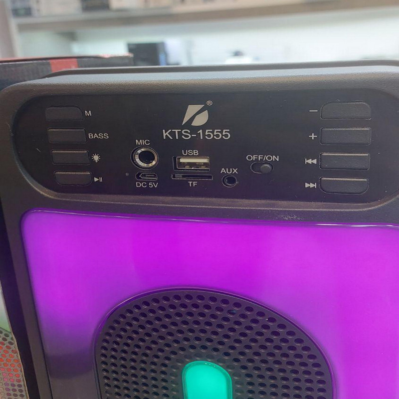 اسپیکر زیبای KTS-1555 با رقص نور صفحه ای قابل تغییر و دو عدد ساب 4 اینچی زیر کاور رقص نور و داشتن رابط کاربری بلوتوثی - فلش و اس دی کارت با پشتیبانی حداکثر از 32 گیگ زیبایی و صدای با کیفیت بالا به کاربر ارایه میکند .این اسپیکر دارای دکمه باس میباشد که صدا را به شکل واضحی تقویت میکند .رقص نور اسپیکر قابل تغییر میباشد و همچنین این اسپیکر دارای یک میکرفون سیمی برای کارهای تمرینی میباشد . زمان لازم برای شارژ باتری 1800 میلی آمپری تا 5 ساعت است و زمان پخش با ولوم بالا حداکثر یکساعت است . اسپیکر قابلت جفت شدن دوگانه با اسپیکر مدل خودش را دارد برای ساخت یک استریو کامل .