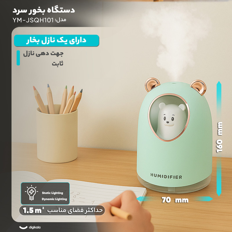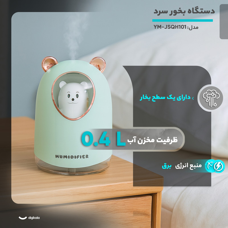 بخور سرد و رطوبتساز مدل YM-JSQH101 دارای مخزن 400 میلیلیتری است و با چراغهای RGB جلوهای زیبا به محیط میبخشد. این دستگاه قابلیت استفاده به صورت شارژی و برقی دارد و منبع تغذیه آن کابل USB از نوع تایپسی است. با توجه به طراحی و قابلیت شارژی بودن، دستگاه مناسب استفاده در خودرو است و همزمان هوای محیط را مرطوب و خوشبو میکند.