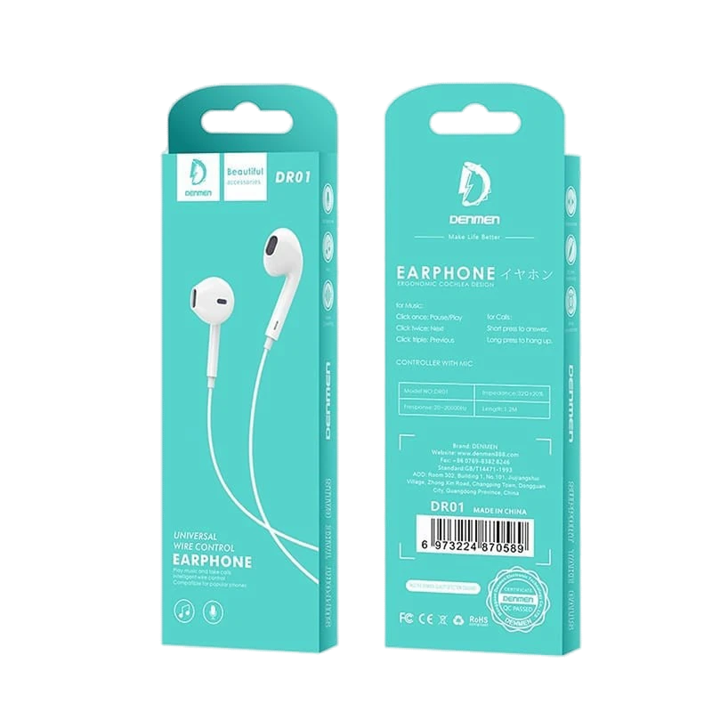 هندزفری «DR01» محصولی از شرکت «وی دنمن وی» است که از طریق جک 3.5 میلیمتری صدا به تلفنهمراه متصل میشود. این هندزفری طراحی بسیار سادهای دارد ولی صدای تولیدی آن بسیار با کیفیت است. هنگام گوش کردن به موسیقی توسط هندزفری دنمن مدل «DR01» شاهد بیس بسیار خوب در آن خواهیم بود. کابل این هندزفری دارای روکش پلاستیکی و با طول 1.2 متر است که مقدار بسیار مناسبی به شمار میرود. روی گوشیهای این محصول سرگوشیهای اپلی تعبیه شده است که دارای ارگونومی مناسب هستند. این سرگوشیها باعث میشوند که هندزفری به خوبی در گوش قرار گیرد. همچنین از نشر صدا به محیط بیرون جلوگیری میکنند. شرکت یک پنل شامل کلید و میکروفن روی کابل «DR01» تعبیه کرده است. به کمک میکروفن و کلید تعبیه شده میتوان به تماسهای تلفنی پاسخ داد. هندزفری «DR01» وزن بسیار کمی دارد و هنگام قرارگیری روی گوش باعث ایجاد مزاحمت نمیشود.