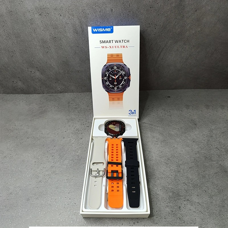 ساعت هوشمند ویزمی مدل WS-X1 Ultra با بدنه آلومینیومی و رنگ مشکی، دارای صفحهنمایش گرد 2.1 اینچی AMOLED با قابلیت لمسی و نمایشگر همیشه روشن است. این ساعت با سایز 46 میلیمتری، مجهز به دکمه پاور، مجیک باتن، پیچ پشت ساعت و قفل بند بوده و از بند سیلیکونی با قابلیت تعویض پشتیبانی میکند. مقاومت در برابر آب، امکان نصب گلس و قابلیت مکالمه مستقیم و از طریق بلوتوث از دیگر ویژگیهای این مدل است. پخش و کنترل موسیقی، بلوتوث، NFC، میکروفون، قطبنما و یادآورهای سلامتی نیز در این ساعت تعبیه شده است، اما از GPS، Wi-Fi، سیمکارت، ذخیره موسیقی و ضبط صدا پشتیبانی نمیکند. حسگرهای ضربان قلب، اکسیژن خون، فشار خون، قند خون، نوار قلب، کالریشمار، گامشمار، پایش خواب، ارتفاعسنج و فشارسنج در این مدل وجود دارند. این ساعت دارای سیستمعامل Watch OS است و با گوشیهای iOS و اندروید سازگار بوده و از منو و اعلانات فارسی پشتیبانی میکند. قابلیتهایی مانند دستیار صوتی، کنترل دوربین گوشی، کورنومتر، تایمر، ماشینحساب، رمزگذاری روی ساعت، داینامیک آیلند و امکان گذاشتن پسزمینه دلخواه را نیز دارد. باتری لیتیوم-یونی این مدل غیرقابل تعویض بوده و اقلام همراه آن شامل 3 بند مختلف و شارژر وایرلسی است.